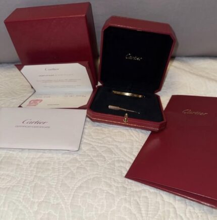 4.300,00€Authentique bracelet Cartier Love en or jaune 18 carats, taille 17 cm, livré avec boîte et papiers officiels Cartier. Symbole d’élégance et de luxe intemporel.