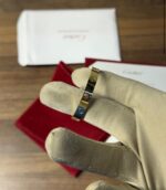 Fabriqué en or jaune 18 carats, ce modèle séduit par son éclat chaleureux, subtilement nuancé d’une touche rosée qui apporte une sophistication supplémentaire. Son design sans pierre met en valeur la pureté du métal et souligne la modernité minimaliste de la collection Love, rendant ce bijou aussi discret que prestigieux.