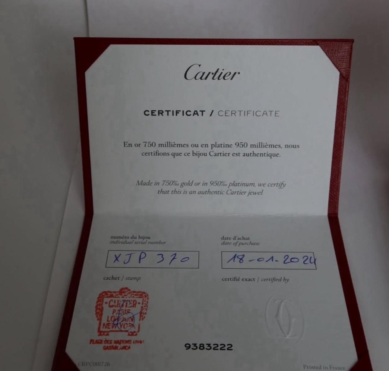Modèle en taille classique, il s’accompagne de sa boîte d’origine et de ses papiers Cartier datés de 2023, garantissant son authenticité et sa valeur. Fabriqué en Suisse, ce bijou séduit par son design intemporel aux lignes pures, symbole d’amour et d’engagement.