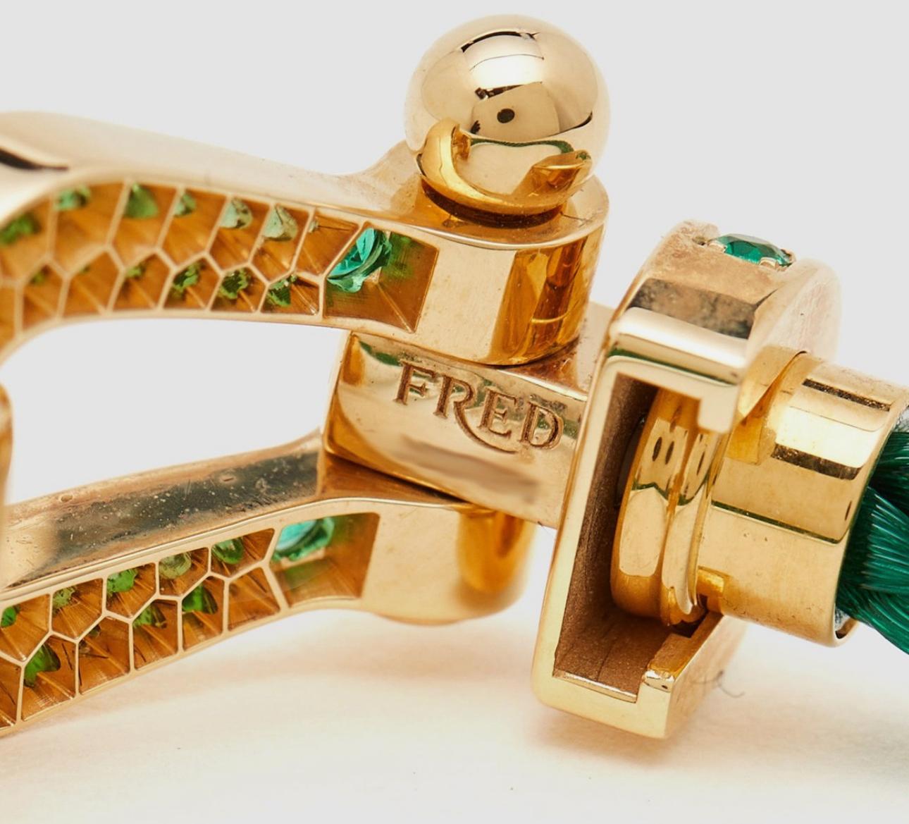 Icône de la maison Fred, ce bracelet Force 10 associe l’or jaune 18 carats à un câble vert émeraude pour un style audacieux et raffiné.