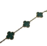 Malachite de Van Cleef & Arpels, un chef-d’œuvre d’élégance et de savoir-faire. Fabriqué en France, ce bijou exquis est orné de cinq malachites en forme de trèfle, chacune nichée dans un écrin d’or jaune 18 carats. La riche teinte verte des pierres principales est sublimée par la somptueuse couleur or, créant un bracelet à la fois saisissant et intemporel.