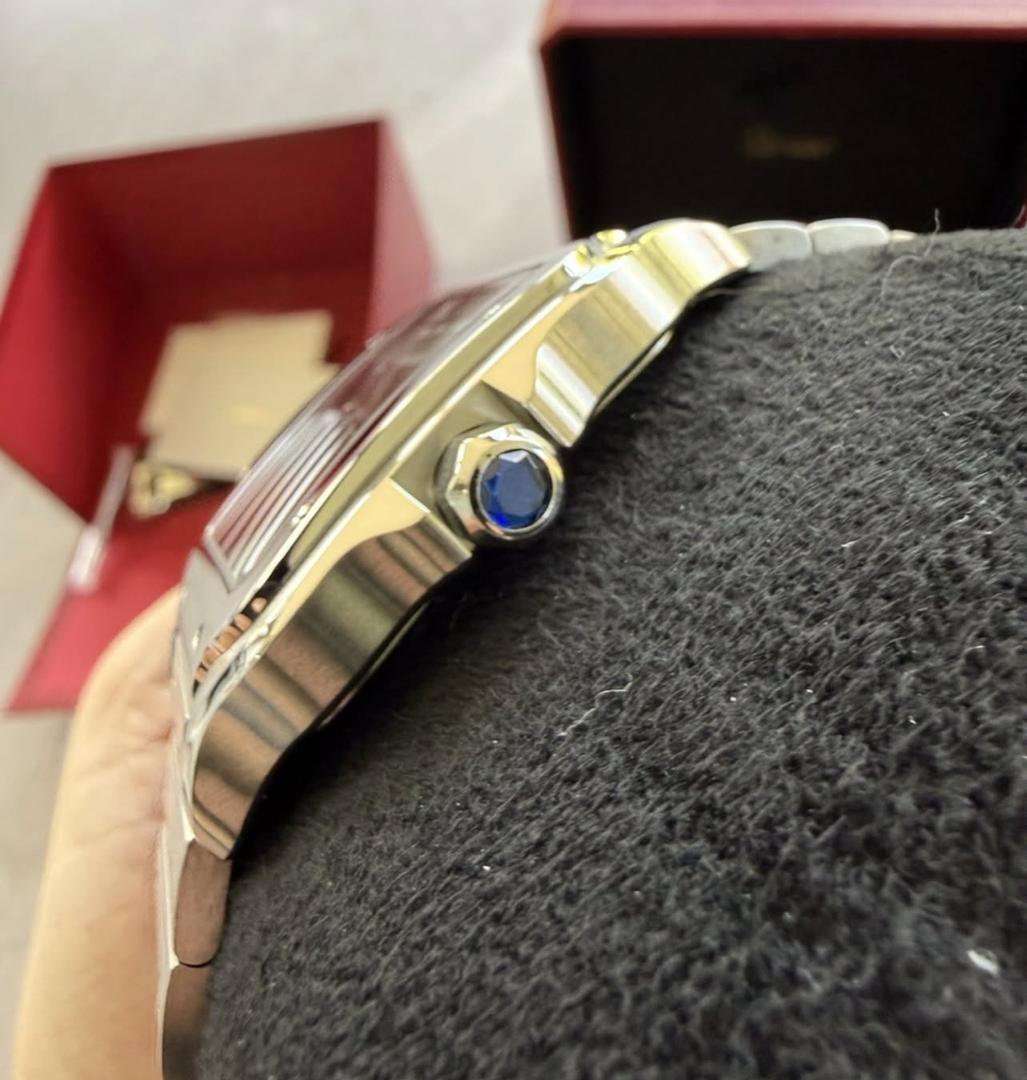 La Cartier Santos Grand Modèle WSSA0018 pour homme est une montre emblématique combinant élégance, précision et robustesse. Son boîtier carré de 40 mm en acier inoxydable, son cadran blanc aux chiffres romains noirs et ses aiguilles bleues en font un garde-temps à la fois classique et moderne.