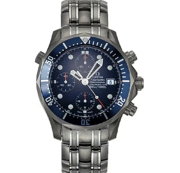Avec son boîtier en titane de 41,5 mm, cette Seamaster offre une solidité exemplaire tout en restant légère au poignet. Conçue pour la plongée professionnelle, elle garantit une étanchéité jusqu’à 300 mètres, et son chronographe intégré assure une précision redoutable.