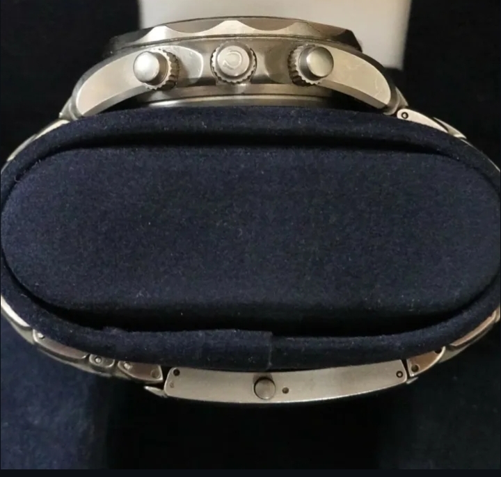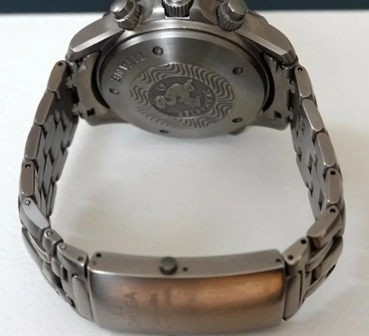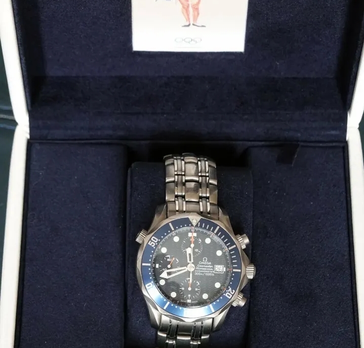 Superbe chronographe Omega Seamaster 300 en titane de 2006, livré avec coffret complet et papiers d’origine, récemment révisé. Un modèle robuste et élégant pour les passionnés de plongée et de montres de collection.