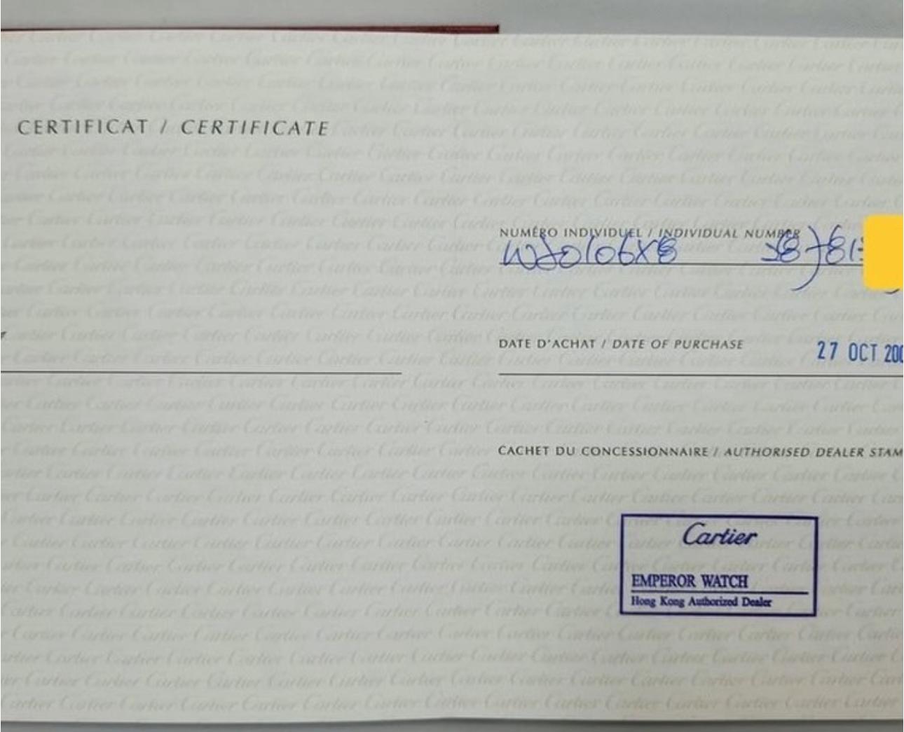 Équipée d’un mouvement mécanique automatique, cette montre offre précision et fiabilité au quotidien. Proposée en excellent état, elle a bénéficié d’un service complet Cartier et bénéficie d’une garantie officielle Cartier jusqu’au 15/03/2027.