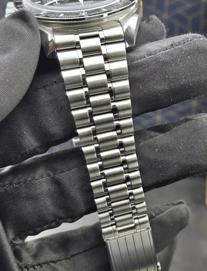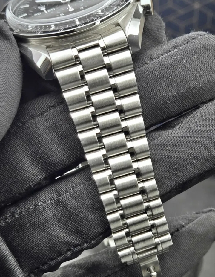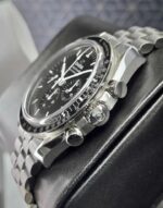 Cette version Saphir se distingue par son verre saphir bombé protégeant le cadran et par son fond transparent, permettant d’admirer le mouvement Omega Calibre 3861 – un chronographe manuel certifié Master Chronometer offrant une précision exceptionnelle et une résistance antimagnétique avancée.