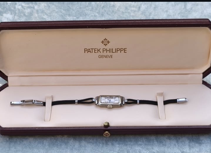 Montre Patek Philippe 1935 pour femme, élégante et intemporelle, en or blanc 18 carats. Livrée complète avec boîte et papiers officiels, parfaite pour collectionneurs ou amateurs de haute horlogerie.