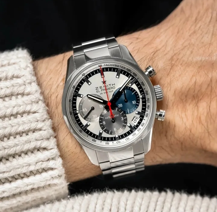 En 1969, Zenith rejoint Heuer et Seiko et devient la première marque à développer et lancer un chronographe automatique. Le mécanisme de Zenith, le plus complexe du groupe, utilise un chronographe à roue à colonnes au sein d’un mouvement à haute fréquence capable de maintenir une précision au 1/10 de seconde. La marque baptise cette prouesse « El Primero » et, plus tard la même année, l’associe à un cadran tricolore distinctif, sous l’emblématique A386.