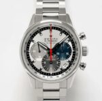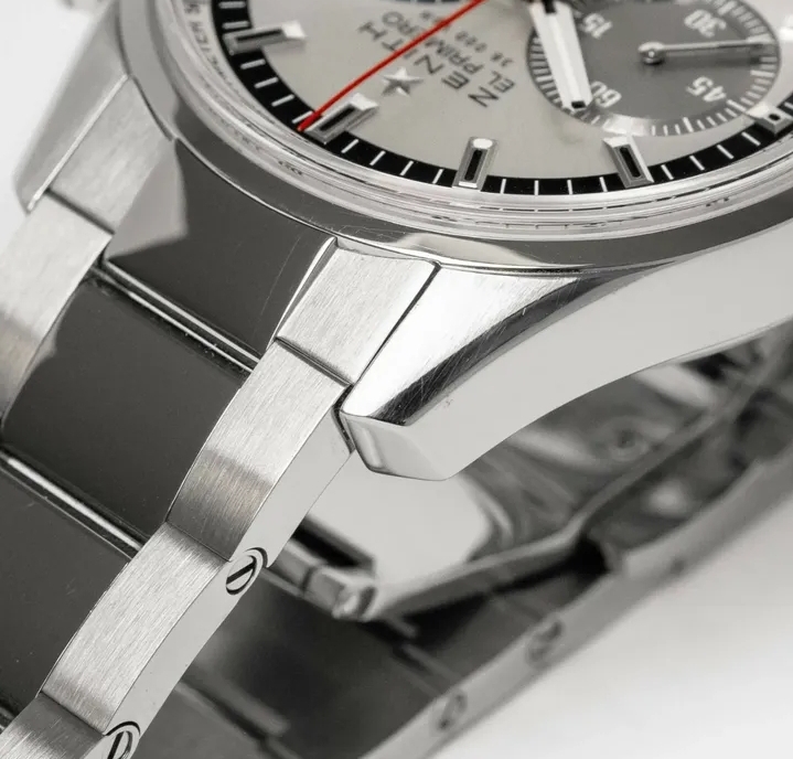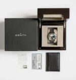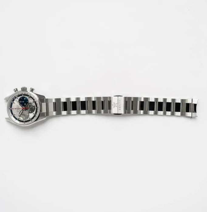La montre proposée s’inscrit dans la démarche post-millénaire de Zenith visant à restituer l’essence visuelle des premiers modèles El Primero de la marque. S’inspirant de l’A386 originale, cette réplique des années 2010 arbore les mêmes compteurs tricolores, les mêmes cornes inclinées et la même aiguille rouge du chronographe. Même les dimensions sont identiques : 38 mm. Cependant, la version moderne présente quelques différences notables, notamment un boîtier plus ajusté au poignet et un fond transparent qui met en valeur le mouvement à 36 000 alternances par heure.